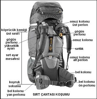 · Çanta bel ayarı;Yüklenen çanta usulüne göre sırta alınır. Öne eğilerek ağırlık omuzdan alınır. Bel kolonu leğen kemiğini saracak şekilde sarılır. Bel kolonu, üst kenarı leğen kemiğine biraz taşacak şekilde sardırılarak bağlanır ve perlonun boşu alınır. Bel kolon perlonu göbek deliğinin biraz altında olmalıdır.